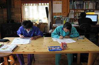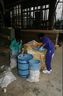 薪ストーブの着火剤として好評のオガレット。本商品を袋詰めする作業を実習しました。
