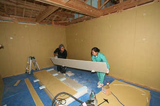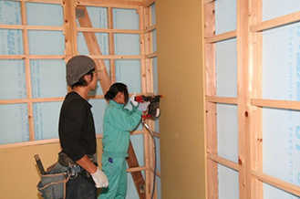 塗壁の下地となる石膏ボードを加工し壁に取り付ける作業を実習しました。